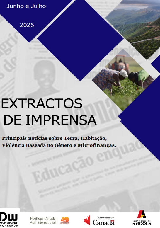 Este documento é uma compilação dos extratos de imprensas mensais onde vem selecionado noticias relacionadas com a terra, habitação, meios de subsistencia, ambiente e violência do género. Pretende-se com esta parte dos extratos de imprensa ser um veiculo de informações ligados as temáticas mencionadas para os diferentes interessados principalmente os distintos beneficiarios do projecto “Espaço Mulher” que está sendo implementado pelo sector de terras da DWA nos municipios do Huambo, Chicala Cholohanga e Cachiungo.