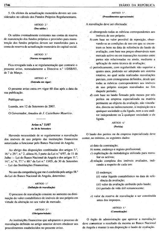 O Aviso nº 11/07 de 26 de Setembro de “Reavaliação de Imóveis”, consiste em regulamentação a reavaliação dos imóveis de uso próprio das instituições financeiras autorizadas a funcionar pelo Banco Nacional de Angola, bem como no aumento ou diminuição do valor contabilística de imóveis de uso próprio em virtude da alteração no seu valor de mercado.