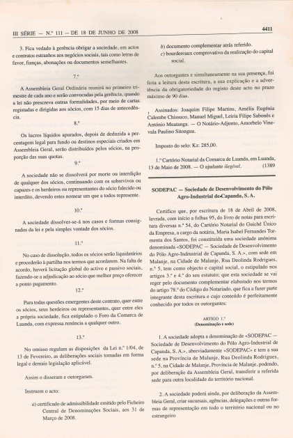 Certificacao No 111-08 – SODEPAC – Sociedade de Desenvolvimento do Pólo Agro-Industrial de Capanga