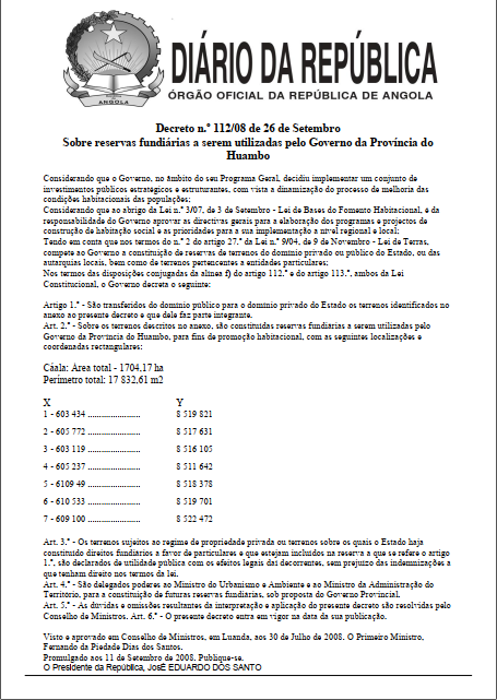 Decreto nº 112-08 de 26 de Setembro – Reservas fundiárias da Província do Huambo.