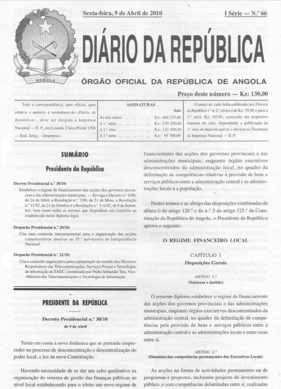 O Decreto Presidencial nº 30/10 de 9 de Abril estabelece o regime de financiamento das acções dos governos provinciais e das administrações municipais, enquanto órgãos executivos desconcentrados da administração central, no quadro da delimitação de competências pela provisão de bens e serviços públicos entre a administração central e as administrações locais. Nestes termos a ao abrigo das disposições combinadas da alínea I) do artigo 120º, e do nº 3 do artigo 125º da Constituição da República de Angola, o Presidente da República aprova o decreto de: O REGIME FINANCEIRO LOCAL.