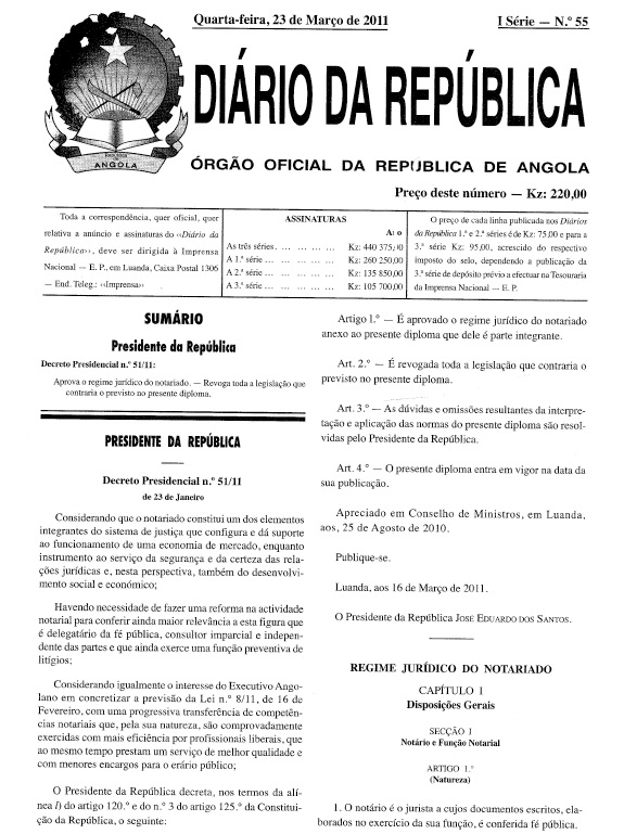 Considerando que o notariado constitui um dos elementos integrantes do sistema de justiça que configura e dá suporte ao funcionamento de uma economia de mercado, enquanto instrumento ao serviço da segurança e da certeza das relações jurídicas. Houve a necessidade de se fazer uma reforma na actividade notarial afim de se conferir ainda maior relevância a esta figura que é delegatária pública. O Presidente da República decreta, nos termos da alínea I) do artigo 120º e do nº 3 do artigo 125º da Constituição da República. O Decreto Presidencial nº 51/11, DO REGIME JURIDICO DO NOTARIADO.