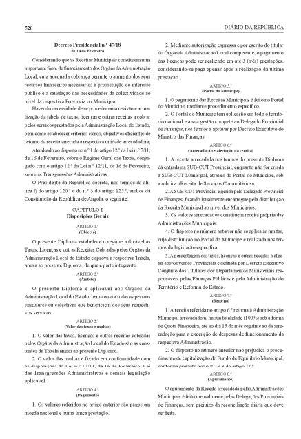 Decreto Presidencial n.º 47-18 – sobre Receitas e taxas dos Municípios