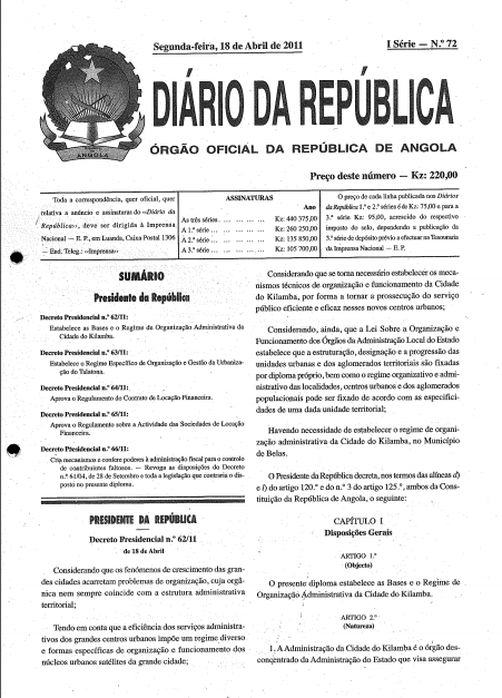 Decreto Presidencial n.º 62-11 de 18 de Abril – Admin da Cidade do Kilamba