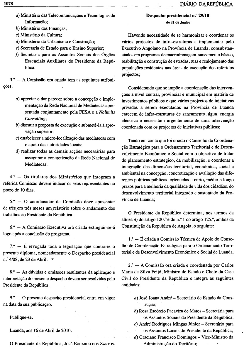 Despacho Presidencial 29-10 – Comissão Ordenamento e Economico e Social de Luanda