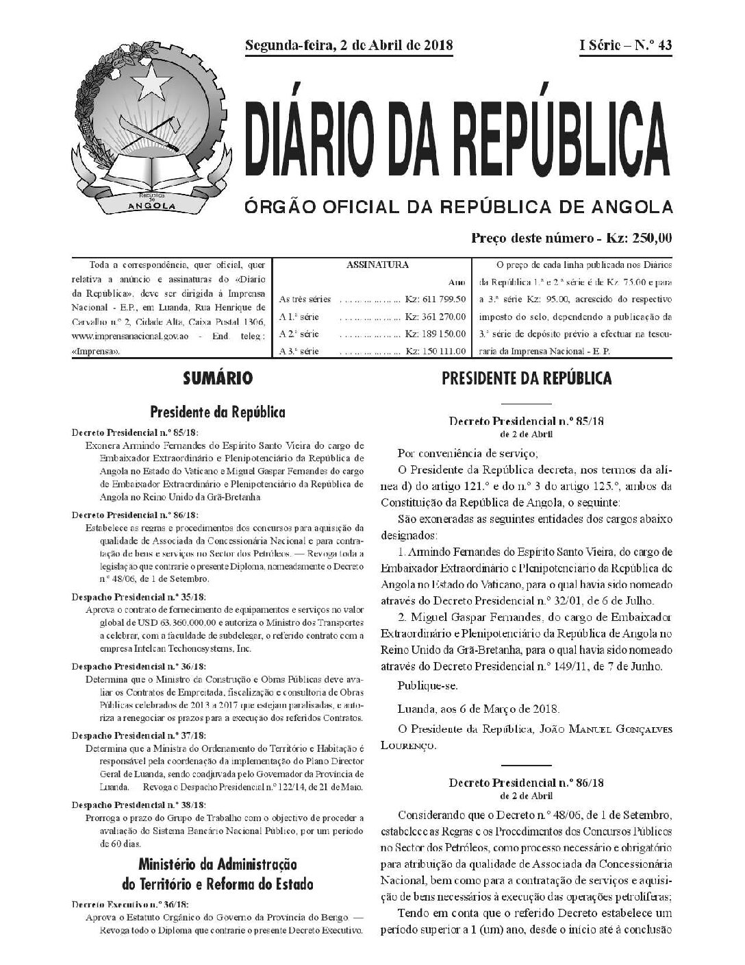 Despacho Presidencial n.º 37-18 – – Comissão de implementação do Plano Director de Luanda April 2, 2018