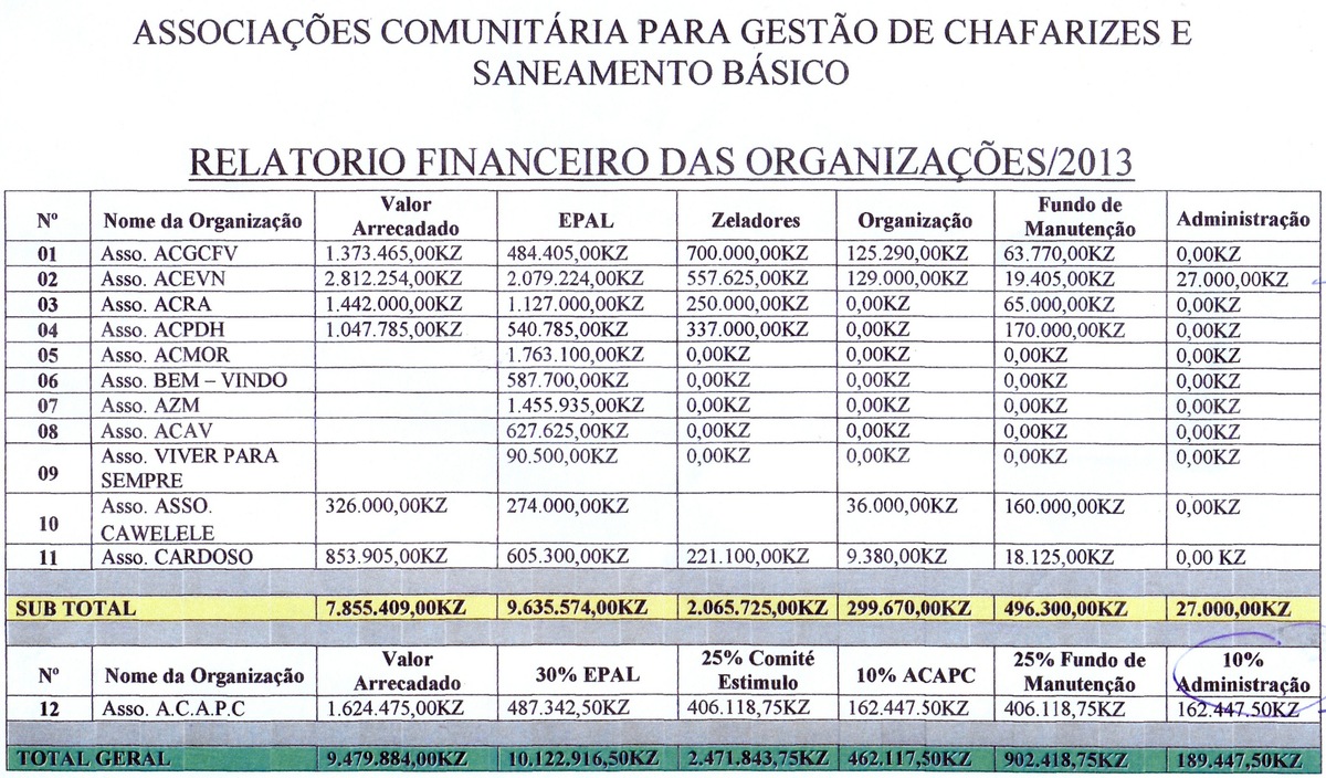 Todas as associações têm o mesmo objectivo fundamental que é o abastecimento de água, para manter a sustentabilidade e continuidade dos sistemas de fonte coletiva de acesso comunitário. Associações de água da comunidade foram criados ao longo do tempo e para cumprir com estes objetivos realizar um conjunto de actividades que visam apoiar os objectivos do Ministério da Energia e Água, atraves do Modelo de Gestão da da Comunidade (MoGECA). As contas financeiras das Associações Comunitárias de água foram apresentados demonstrando publicamente que Kz 9.479.888,00 foram gerados para cobrir os custos de manutenção e pagar EPAL para o fornecimento de água aos consumidores.