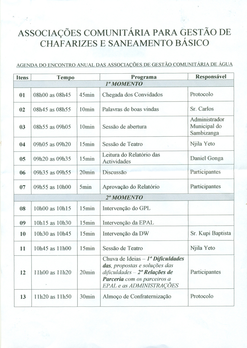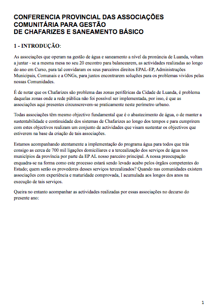 The Provincial Community Water Associations are closely monitoring the implementation of the Water for All program which brings with it the extension of standposts to the periphery of the city, as well as approximately 700,000 residential connections and the out-sourcing of the management of water services in the municipalities of the province by the EPAL our main partner. Community water associations have proven experience and maturity, accumulated during the long years of the implementation of such services. Community water associations are well managed and financially sustainable and should be accepted by EPAL as preferred implementing partners in their out-sourcing strategy. The Conference of Provincial Water Associations support the Government’s efforts to bring domestic water connections to households in Luanda but defend the need for the extension of the community standpost network to serve as a medium-term objective of providing water supply within 100 meters of 85% of homes before 2017.