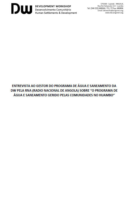 RNA: O projecto do modelo de gestão comunitária, desenvolvida nas provincia do Huambo, Cunene, Luanda e Cuanza Sul, num total de 10 municípios é composto por 16 associações de água que trabalham na gestão e funcionamento de água nesta região, os projecto da DW estão implementados nos municípios sede do Huambo, Catchiungo e Bailundo, onde já foram construido mais de 520 pontos de água de acordo com o gestor do programa de água e saneamento da DW em Angola Cupi Baptista os mais de 1040 zeladores que fiscalizam diariamente os pontos de água trabalham na sencibilização e mobilização social das práticas de higiene e saneamento nas comunidades.