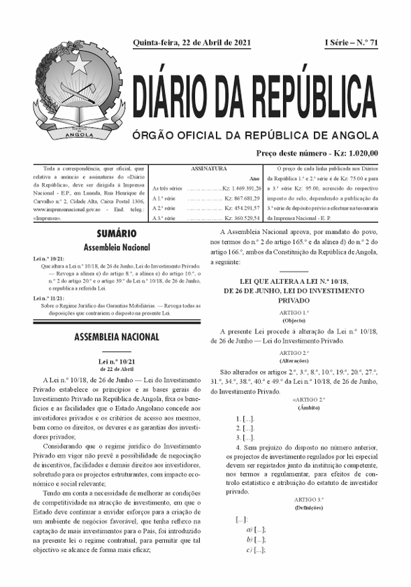 A Lei nº 10/18, de 26 de Junho – Lei do investimentos Privado estabelece os principios e as bases gerais do Investimento Privado na República de Angola, fixa os benefícios e as facilidades que o Estado Angolano concede aos investidores privados e os critérios de acesso aos mesmo, bem como os direitos, os deveres e as garantias dos investidores privados.