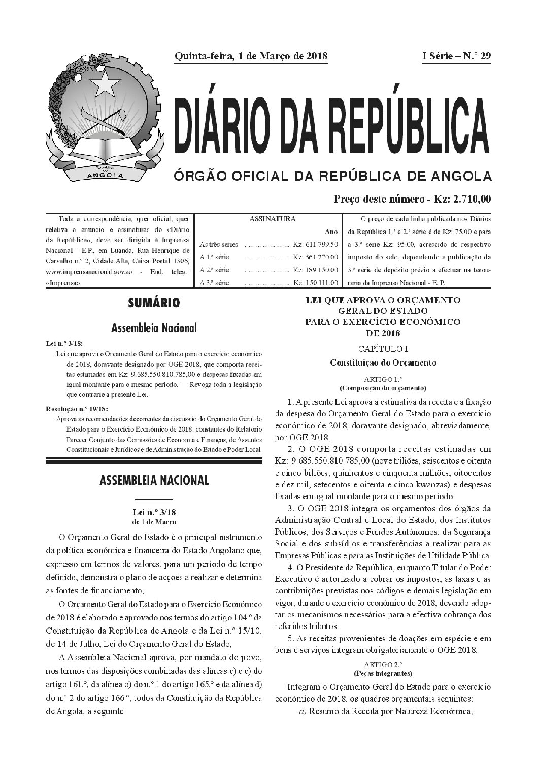 Lei n.º 3-18 de 1 de Marco – Orcamento de Estado para 2018