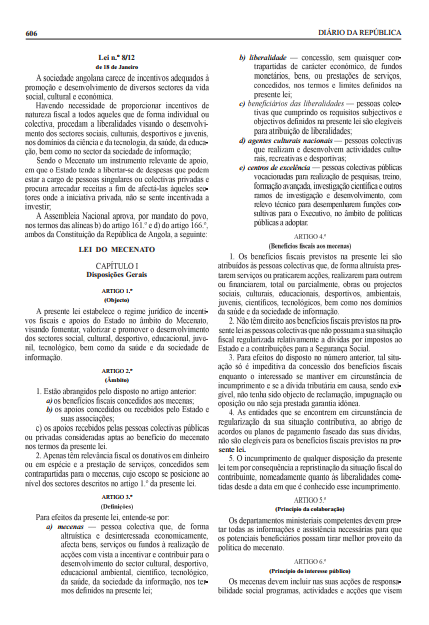 Lei n.º 8-12 – Lei do Mecenato January 18, 2012 A Lei nº 8/12 de 18 de Janeiro : A sociedade angolana carece de incentivos adequados a promoção e desenvolvimento de diversos sectores da vida Social,Cultura e económica.