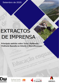 Principais notícias sobre Terra, Habitação, Violência Baseada no Gênero e Microfinanças.Deste modo este documento é uma compilação dos extratos de imprensas mensais onde vem selecionado noticias relacionadas com a terra, habitação, meios de subsistencia, ambiente e violência do género.