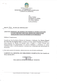 Incumbe-me Sua Excelência Ministra do Urbanismo e Habitação, Dra. Branca Manuel da Costa Neto do Espirito Santo, à remeter ao Exmo. Senhor Presidente da APIMA, a nossa proposta de Modelo de permuta entre o Estado e o Sector Privado para desenvolvimento de infraestruturas em reservas fundiárias e solicitamos os vossos contributos sobre a referida proposta...